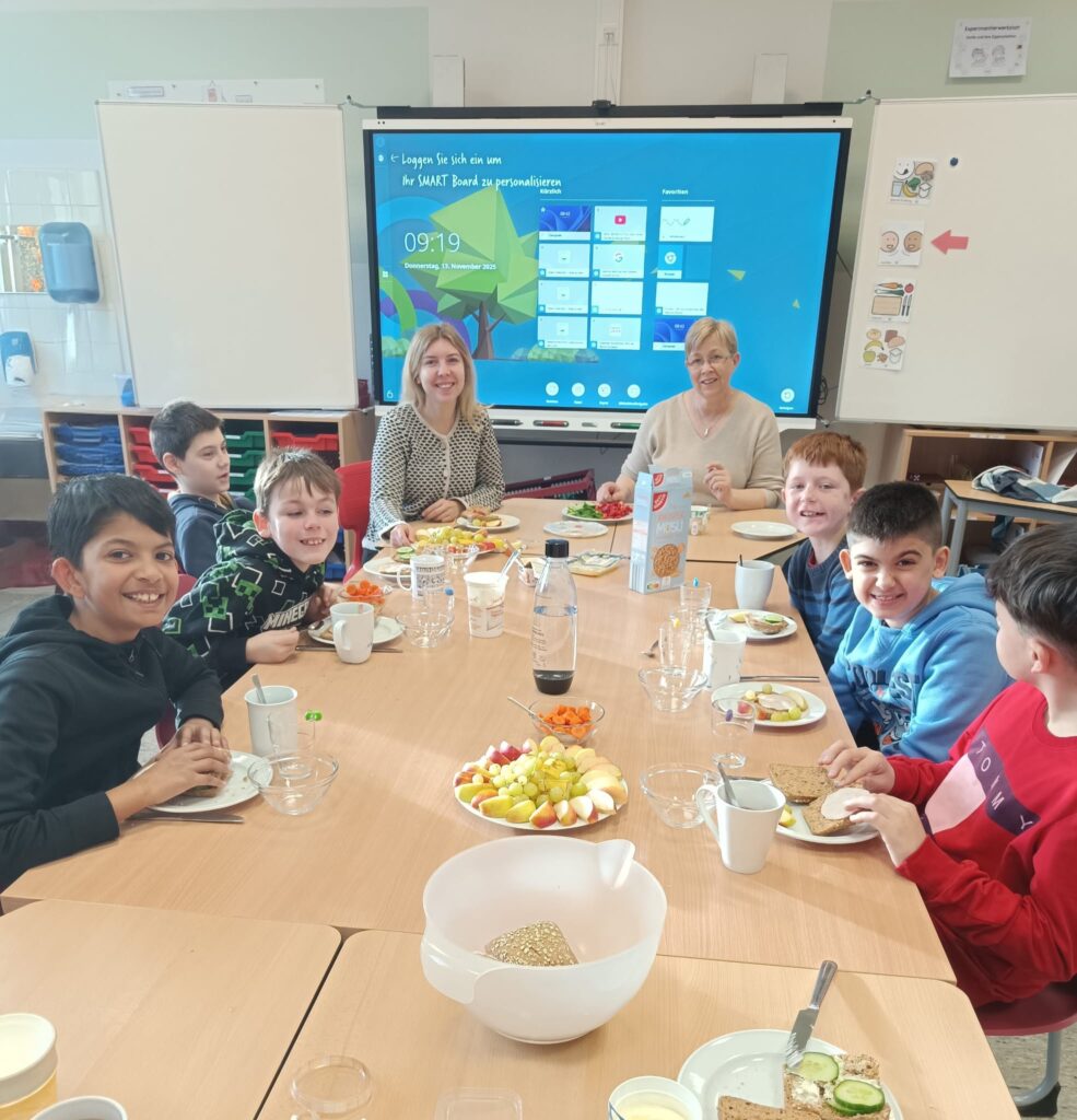 Die Klasse 4 hat zum Abschluss ihres Projekts „Gesunde Ernährung“ ein gesundes Frühstück veranstaltet. In den vergangenen Wochen haben die Schülerinnen und Schüler sich im Sachunterricht intensiv mit dem Thema gesunde Ernährung beschäftigt. Unter anderem haben sie die Ernährungspyramide kennengelernt und untersucht, wie viel Zucker in verschiedenen Lebensmitteln und Getränken steckt. Zum Schluss haben die Kinder gemeinsam überlegt, was sie für ein gesundes Frühstück brauchen, und dann ein leckeres Frühstück mit viel Obst und Gemüse zubereitet.