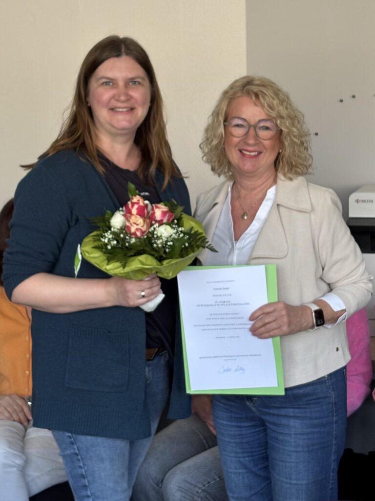 Unsere Schulleiterin überreichte heute der Förderschullehrerin Gabi Bokel die Dankesurkunde des Landes Niedersachsen zum 25-jährigen Dienstjubiläum. Frau Krassen würdigte Frau Bokel als tolle Lehrerin, die sich überaus für die Belange der Schülerinnen und Schüler und für das Kollegium einsetzt. Als Dankeschön für Ihr großes Engagement erhielt sie außerdem einen Blumenstrauß vom gesamten Kollegium.